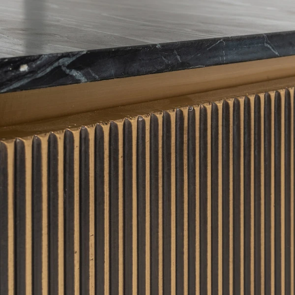 Wat de meubels uit de Richmond Interiors Ironville serie bijzonder maakt zijn de luxe materialen. Hout bekleed met metaalplaat zorgt voor een messing gloed; een blad van echt marmer maakt de stijl compleet. Combineer het tv-meubel met een bijpassende salontafel of een wandkast met messing ribbelmotief!
