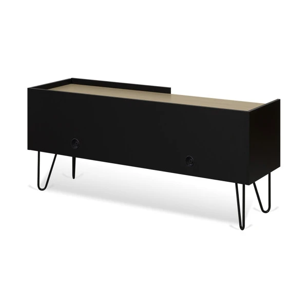 Dit TemaHome Nina tv-meubel combineert design met sfeer. Eiken planken zorgen voor een natuurlijke uitstraling, terwijl de strakke lijnen echt een moderne look geven! Maar het zijn de V-poten die het tv-meubel zo elegant maken. Zet apparatuur en boeken of decoraties in de open vakken; dankzij de schuifdeur kun je elk moment bepalen wat in zicht is. Welk dressoir past het beste in jouw interieur: zwart of wit?