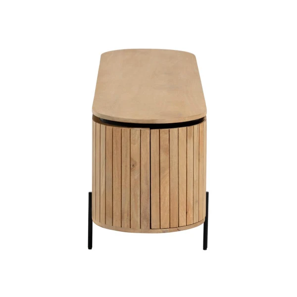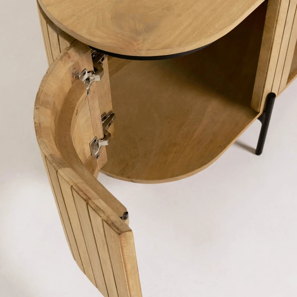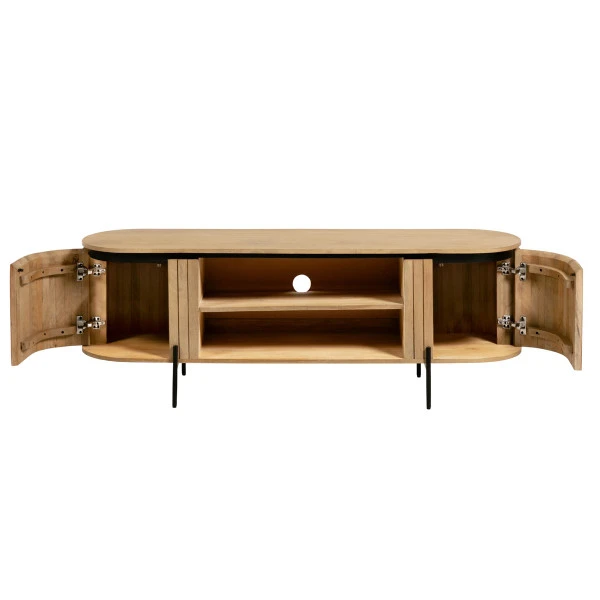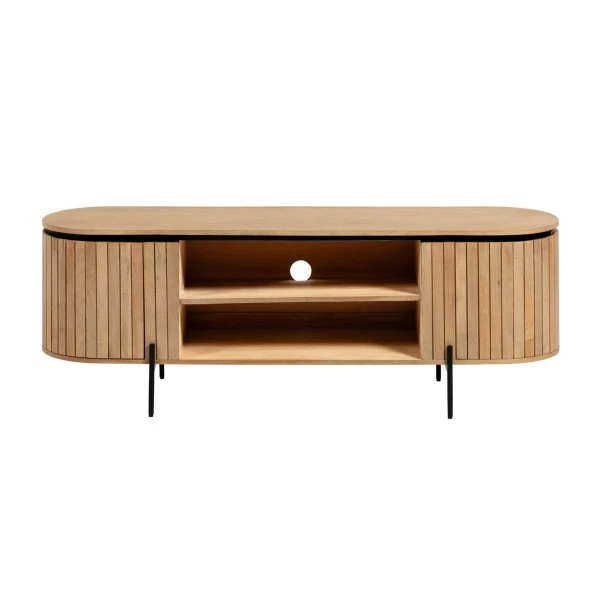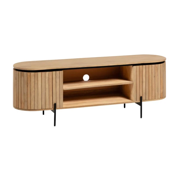 Dit Kave Home Licia tv-meubel heeft een elegant, ovaal design met slanke pootjes. De tientallen stroken mangohout zijn met de hand afgewerkt voor een verfijnd resultaat! Zet je apparatuur in de open vakken en werk de snoeren netjes weg via de kabelopening. Achter de – subtiel verstopte- deuren van mangohout is dan nog ruim plaats voor de losse rommeltjes die anders je zithoek zo ongezellig maken!