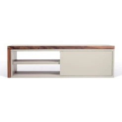 In het TemaHome Move tv-meubel is plaats voor je apparatuur en een stel gezellige decoraties. Achter de schuifdeur vind je één groot en twee kleinere vakken. Dankzij de mix van mat grijs en walnootfineer past het uitschuifbaar tv-meubel mooi in een modern, Scandinavisch of zelfs retro interieur.