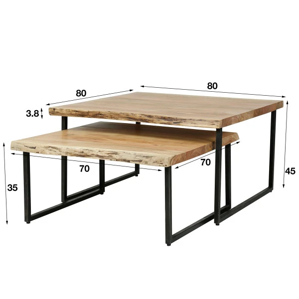 Deze vierkante salontafel set is gemaakt van echt acaciahout met een natuurlijk karakter. Omdat het boomstam blad voorzien is van een beschermende coating blijft het lang mooi. Een stoer onderstel van metaal geeft de salontafel set een industriële uitstraling! Schuif de kleine tafel half onder de grote of gebruik de kleine als bijzettafel naast de bank.
