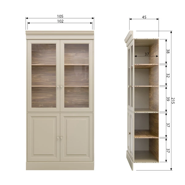 - Achter de glazen deuren bevinden zich 3 legplanken (H: 38 cm, B: 103 cm, D: 36 cm)