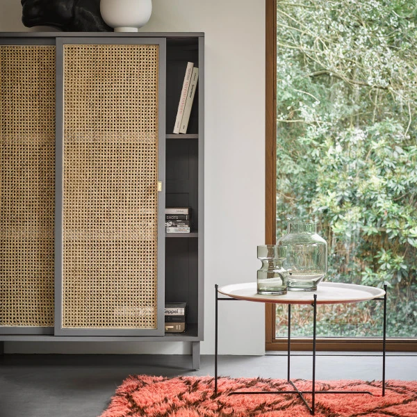 Wat de HKLiving Webbing kast zo gezellig maakt zijn natuurlijk de schuifdeuren van rotan. Messing details vullen de retro look perfect aan! Je hebt keuze uit twee varianten van deze kast: met een wit of zwart gelakte ombouw van mangohout. Welke staat het mooiste in jouw woonkamer? Berg er serviesgoed in op of manden vol met rommeltjes. Eigenlijk komt de webbing kast met schuifdeuren in elke woonruimte van pas!