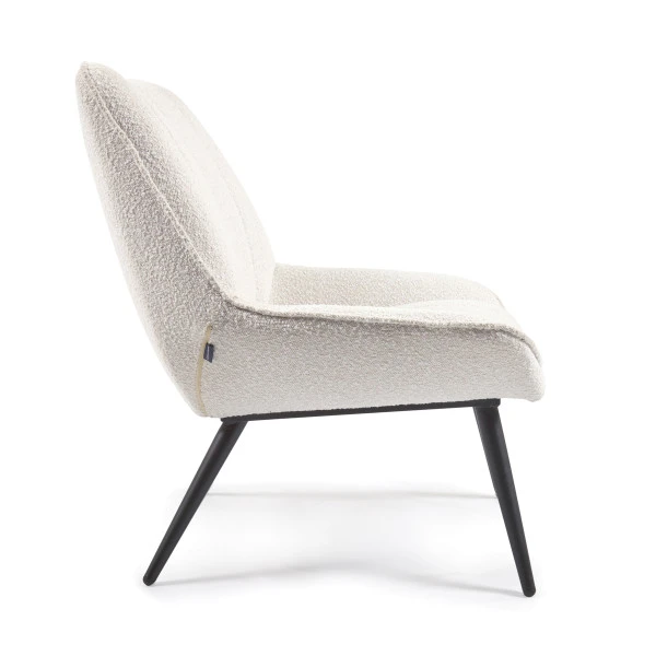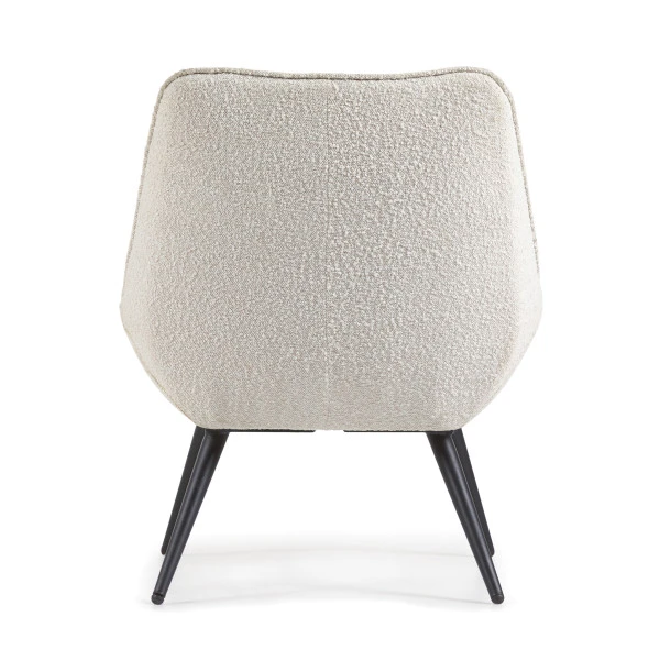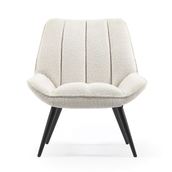 Met de Kave Home Marlina fauteuil in de zithoek is je lange werkdag gauw vergeten. Zak heerlijk weg in de zachte kussens van witte bouclé met schuimvulling. De fauteuil is zo breed dat je er met opgetrokken benen in kunt zitten; een dekentje over je knieën op een koude winteravond. Genieten! De witte bouclé fauteuil met zwart metalen poten past mooi in een modern of retro interieur.