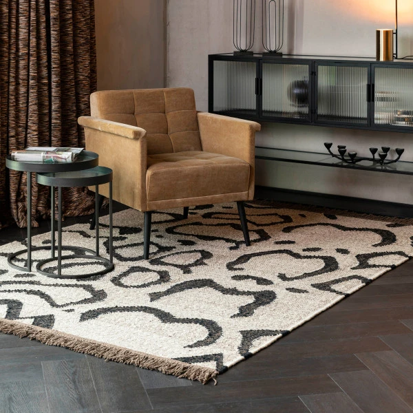 Het Dutchbone Ayaan tapijt brengt een Afrikaans sfeertje naar je woonruimte. Het wollen tapijt is voorzien van een subtiel, speels patroon dat doet denken aan de vacht van een luipaard. Tegelijkertijd geven de aardse kleuren het wollen tapijt een natuurlijke uitstraling. Een echte sfeermaker in je interieur!