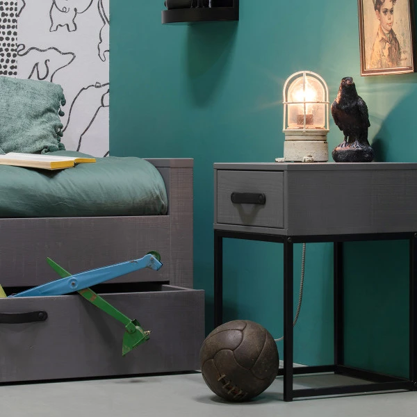 Het Woood Morris nachtkastje is stoer en stijlvol tegelijk. De perfecte mix van moderne en industriële elementen. Je kunt het nachtkastje van grijs hout aan beide kanten van het bed gebruiken! Zet er een fijne leeslamp op en berg je boek, telefoon en nachtcrèmes netjes weg in de lade. Zo ziet je slaapomgeving er voortaan altijd rustig en opgeruimd uit.