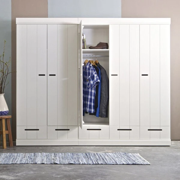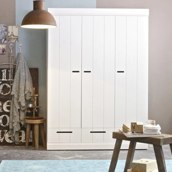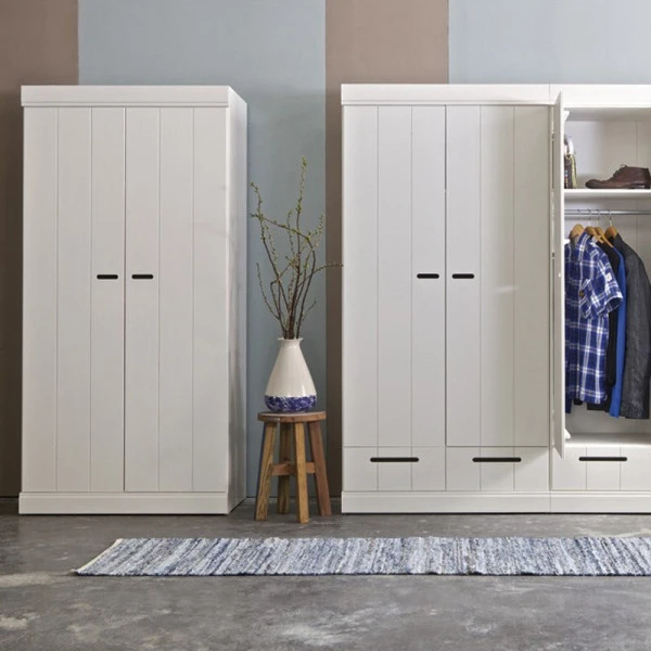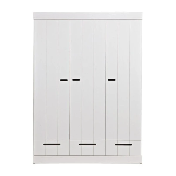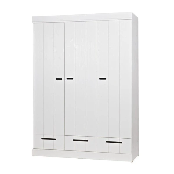 De Woood Connect serie zit boordevol witte, grenenhouten kasten met een modern landelijk sfeertje. Behalve deze 3-deurs kledingkast kun je in de serie terecht voor een hoge ladekast en kasten met een meer uitgesproken locker design!