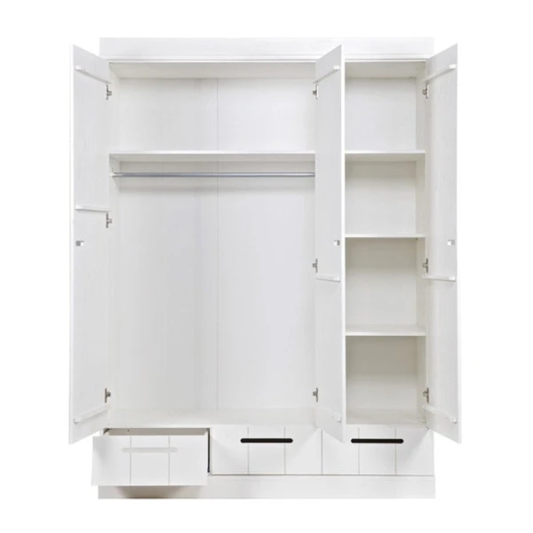 Bijzonder aan de Woood Connect kledingkast is de mix van landelijk, modern en industrieel. De landelijke look overheerst, maar de 3-deurs kledingkast heeft ook details van een stoere lockerkast! Met een breedte van 140 centimeter, drie deuren en drie lades biedt de witte kast heel wat ruimte voor je kleding. Je vindt er een hanggedeelte met roede, maar ook legplanken voor t-shirts en truien.