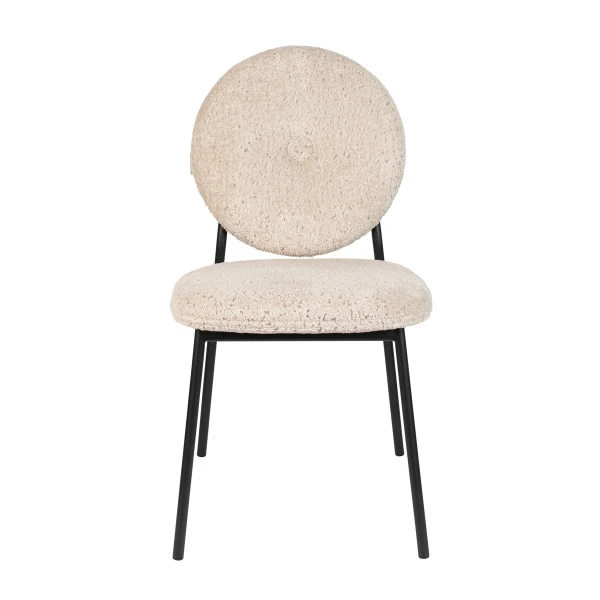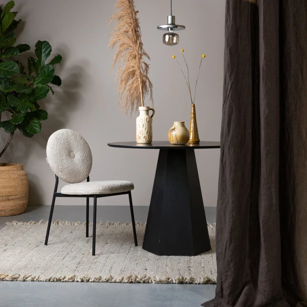 Op de Zuiver Mist eetkamerstoel wil je de hele dag wel zitten! De retro eetkamerstoel is namelijk voorzien van PU-schuimvulling in de kussens én een heerlijk zachte teddy stof. Tegelijkertijd zorgen de slanke poten en ronde kussens voor een elegant, retro geheel. Leuk aan een ronde eettafel van zwart metaal!