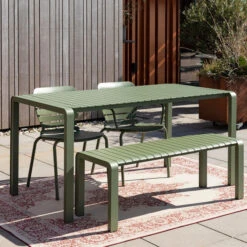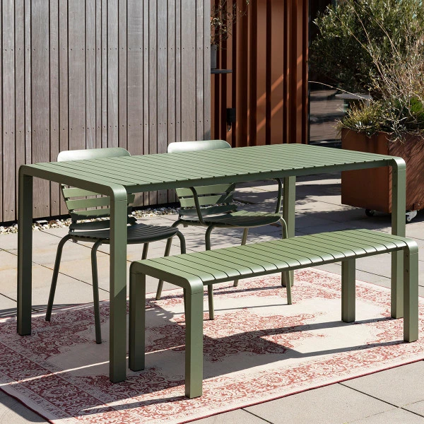 - Set van 1 tafel (168,5 cm), 1 bankje (130 cm) en 2 stoelen