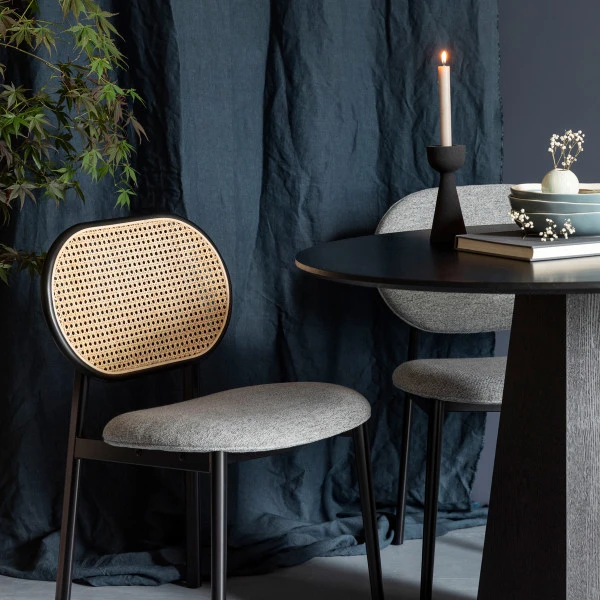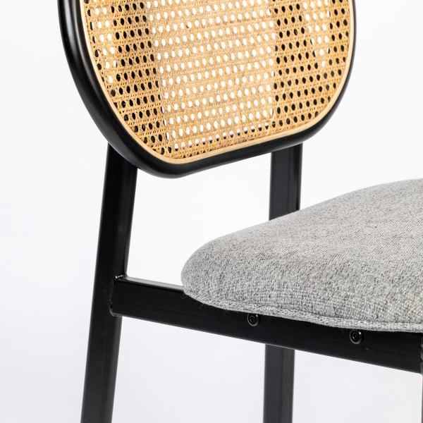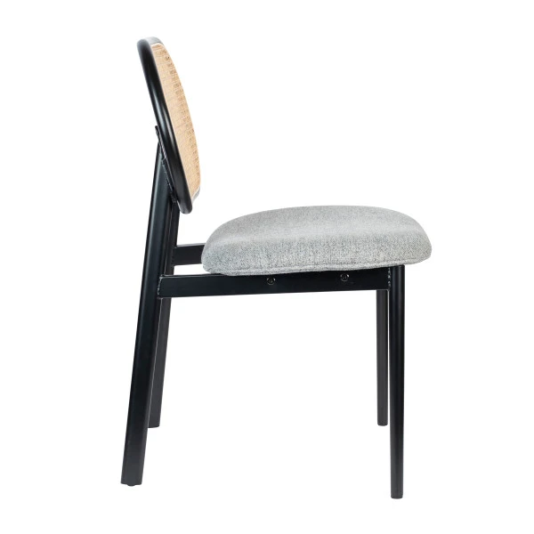 Wat deze Zuiver Spike Webbing eetkamerstoel zo bijzonder maakt is de rotan rug. Samen met het frame van zwart metaal en het zitkussens van stof zorgt de webbing leuning voor een speels geheel! Ook de ronde vormen dragen bij aan het retro design van de eetkamerstoel. Je hebt keuze uit twee kleuren zitting: roze of grijs. Combineer ze aan tafel om je eethoek nog gezelliger te maken.