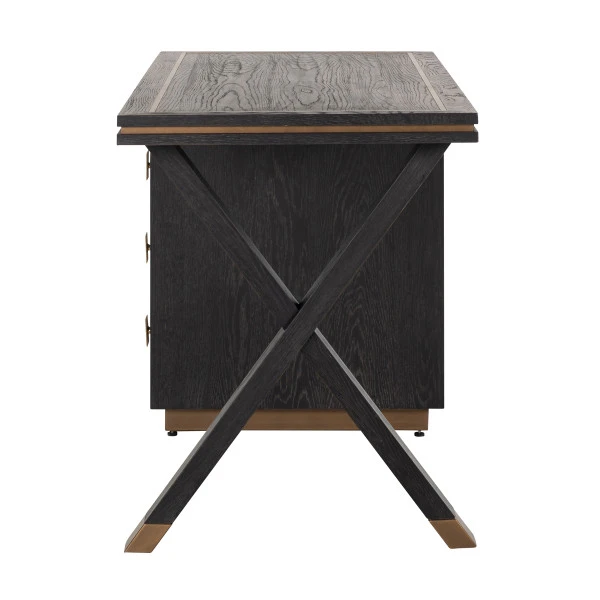 Dit Richmond Interiors Hunter bureau kun je gerust een plekje in de woonkamer geven! Het asymmetrische design is bijzonder stijlvol. Bovendien is het hout ingelegd met vlakken van mat goud, die een mooi contrast vormen met het zwart! Het bureau heeft drie ruime lades waarin je kantoorartikelen, administratie of hobbymaterialen kunt opbergen.