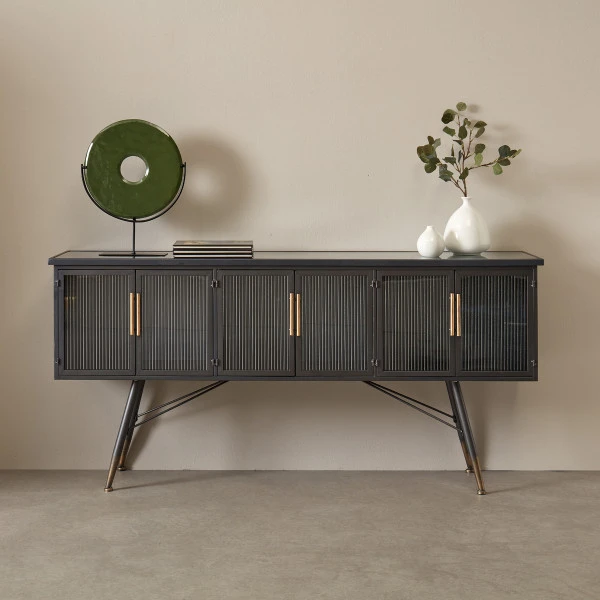Bijzonder aan het Kare Design Gomera dressoir is de mix van stijlvolle en speelse elementen. De schuine poten geven het dressoir van zwart gepoedercoat staal een eigenzinnige look; de messing voetjes en handgrepen zorgen juist voor een stukje klasse. Berg serviesgoed op achter de deuren van geribbeld glas of gebruik het dressoir voor boeken, fotoalbums en speelgoed.