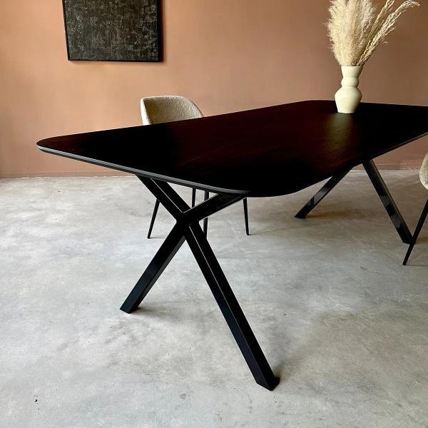 - Tafelblad (2 cm) van hoogwaardig eikenfineer met voelbare houtstructuur en mat zwarte afwerking