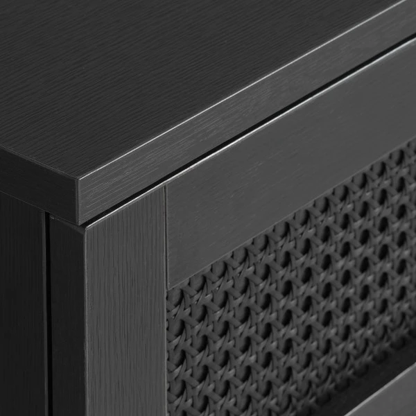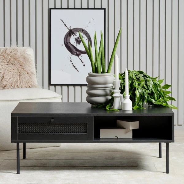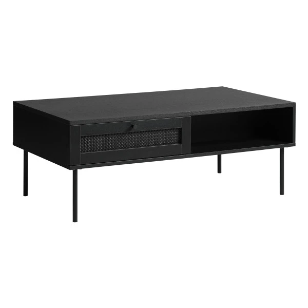 - Salontafel is gemaakt van zwarte melamine met rotan