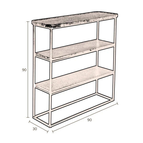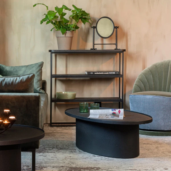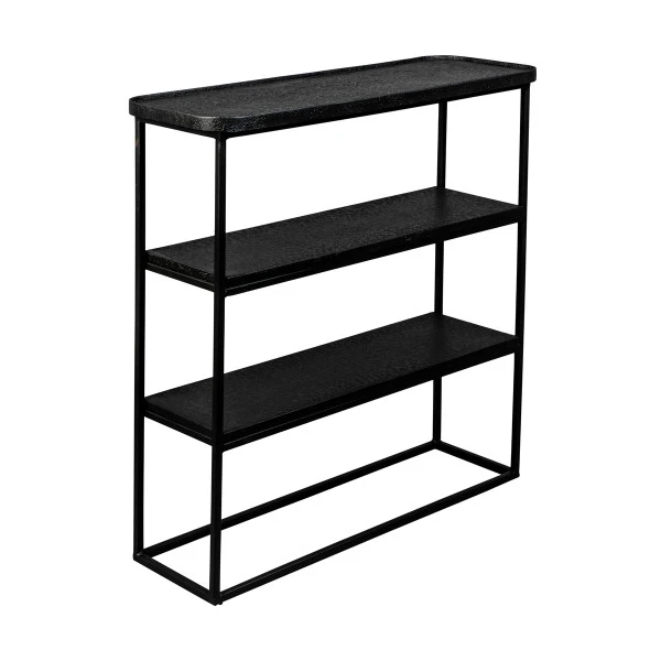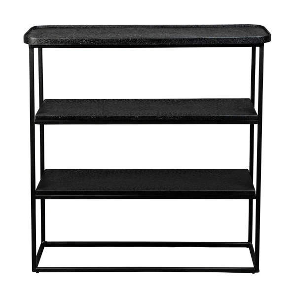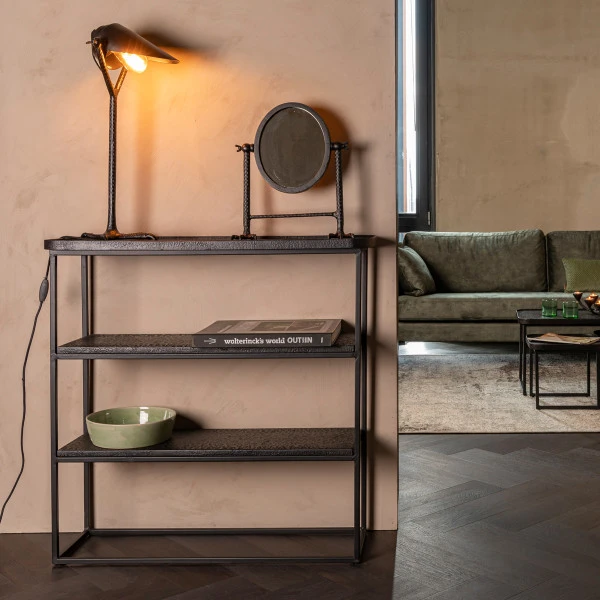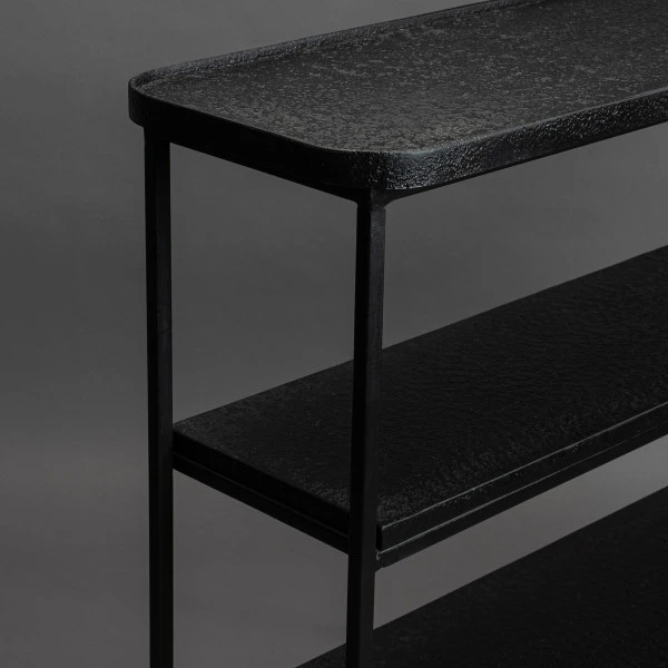 - Sidetable met drie planken met een stoere, mat zwarte metaal afwerking